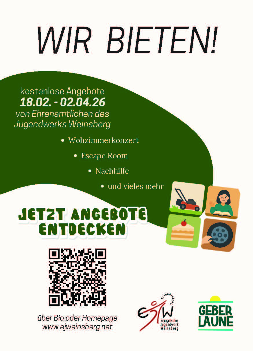 Wir, das evangelische Jugendwerk Weinsberg, sind mehr als 150 ehrenamtliche Mitarbeiterinnen und Mitarbeiter, die sich in der Kinder, Jugend-, Erwachsenen und Familienarbeit im Teilgebiet Weinsberg des evang. Kirchenbezirk Weinsberg-Neuenstadt engagieren. Mithilfe unterschiedlicher und vielfältiger Angebote und Aktionen, vom Jugendgottesdienst bis zu Freizeiten und Jungscharlagern, wollen wir unserem Leitbild gerecht werden und Menschen begegnen, Gaben entdecken und gemeinsam mit Jesus Christus leben.