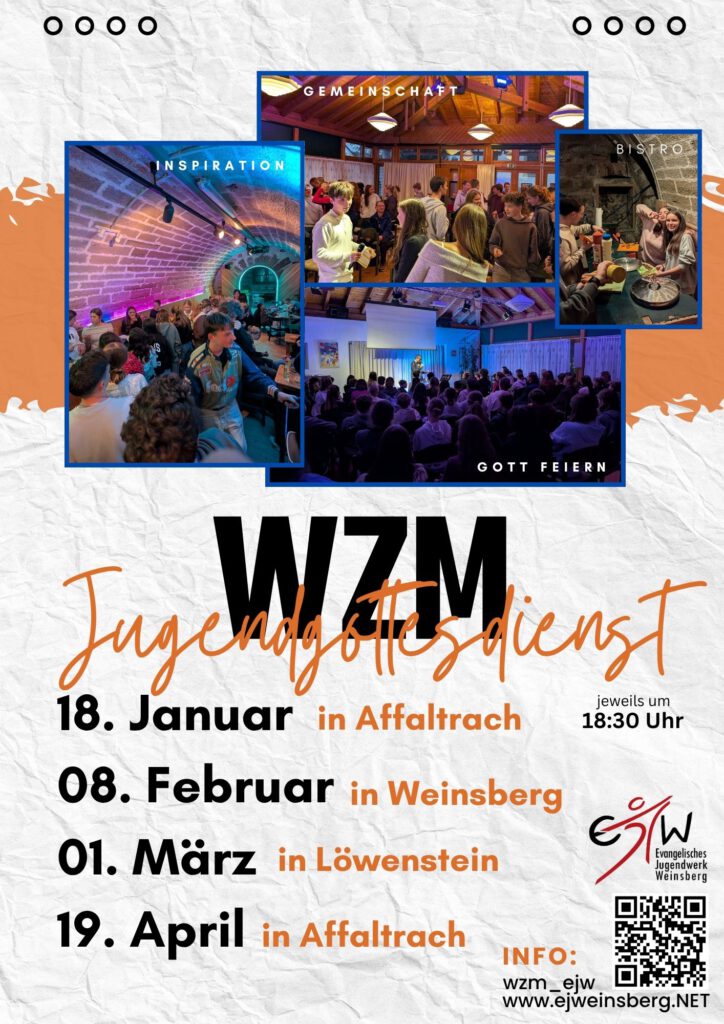 Das WzM – „Wort zum Montag“ ist der Jugendgottesdienst des evang. Jugendwerk Weinsberg. Er findet einmal im Monat statt und hat als Zielgruppe Jugendliche im Alter von 13 bis 17 Jahren. Im Vordergrund steht beim WzM ein alltagsnaher Impuls, moderne Musik, eine lockere Atmosphäre und die Möglichkeit, vor und nach dem Gottesdienst im Bistro Gemeinschaft zu erleben.